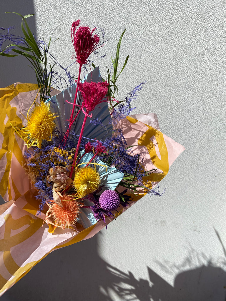 Meet our curated selection of dried and preserved florals in designed arrangements or by the stem. Our drieds are made using a curated mix of dried florals, foliage and palms. Often utilizing preserved and dyed materials, these bouquets each vary in texture and materials.