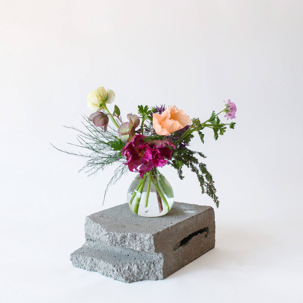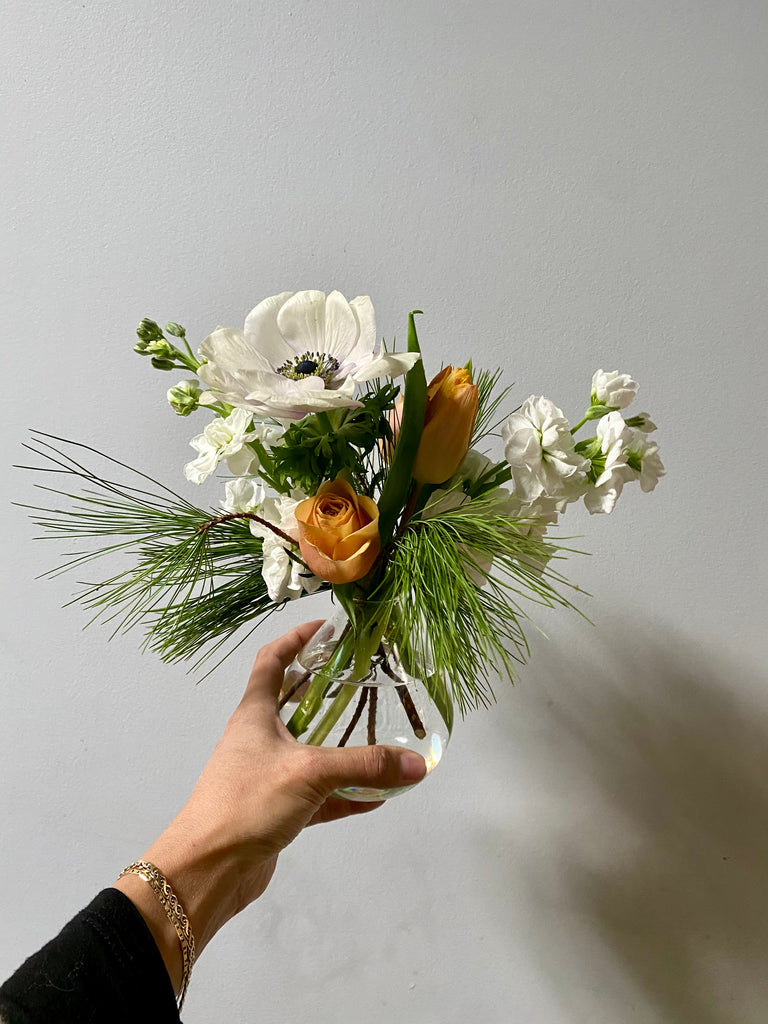 Our bitty bud vase is a sampling of our favorite fresh florals based on season. Perfectly sized for a small space, this dainty arrangement is like a passing compliment - sure to be a midday pick me up.