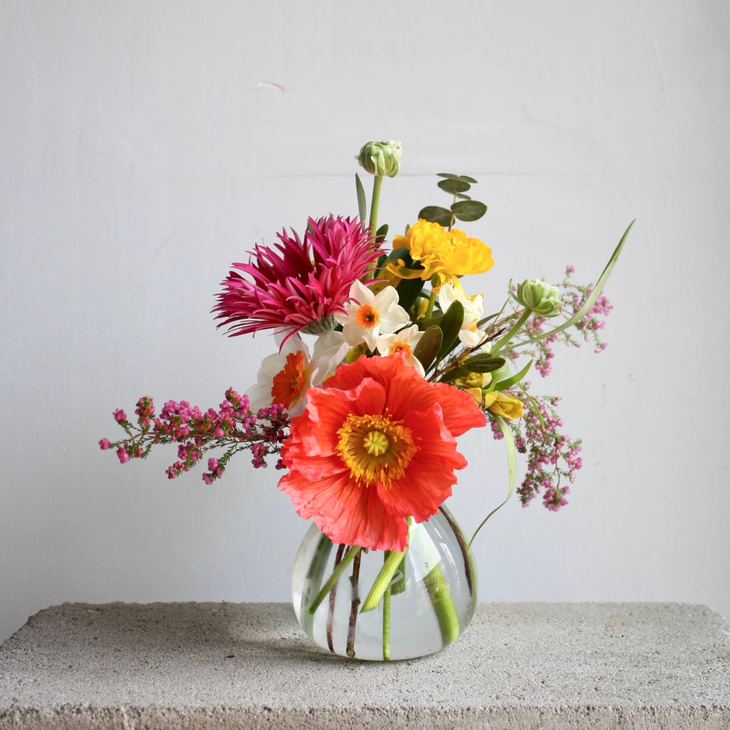 Approximate finished size: Bitty Bud Arrangement (6” H x 4” W). Designed in smoked or clear glass vessel to be view all-around. We are a floral foam-free shop, designing all of our arrangements in water. Boxed with tissue paper. Card with flower types and origin included.