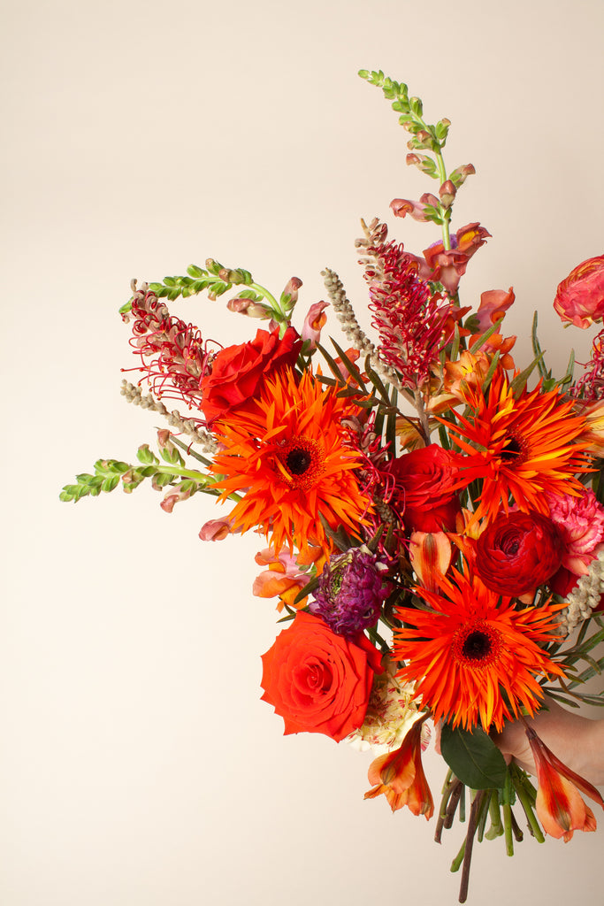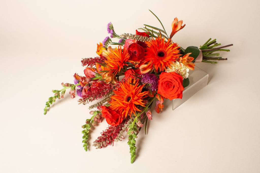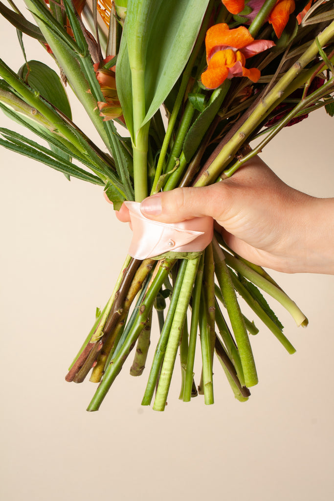 Classic bouquets are sized approximately 12"-14" W and contain up to (25) stems of floral & foliage. Finished with a satin ribbon wrap on handle with exposed stems.