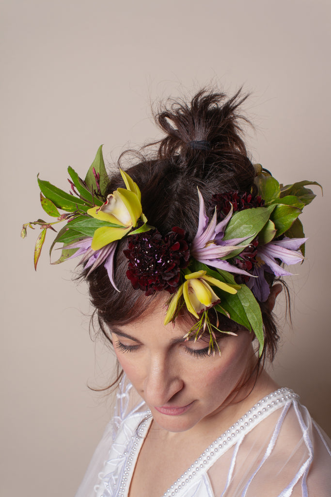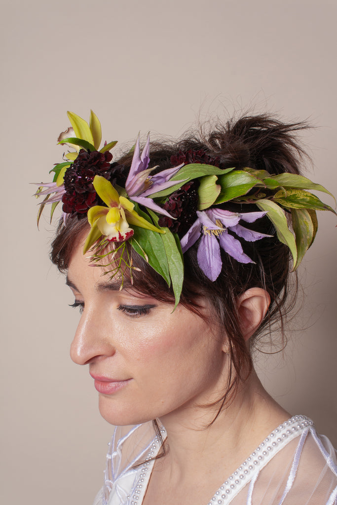 The Flower Crown is a magical addition to any event. Our flower crown features focal flowers and foliage around the whole crown and will add a free-spirited flair to any special day. Flower crowns are popular additions to weddings, but we think any excuse is a good excuse to wear flowers in your hair. Celebrate a special birthday, wedding or baby shower, summer solstice, communion, or bachelorette with a diadem of flowers.
