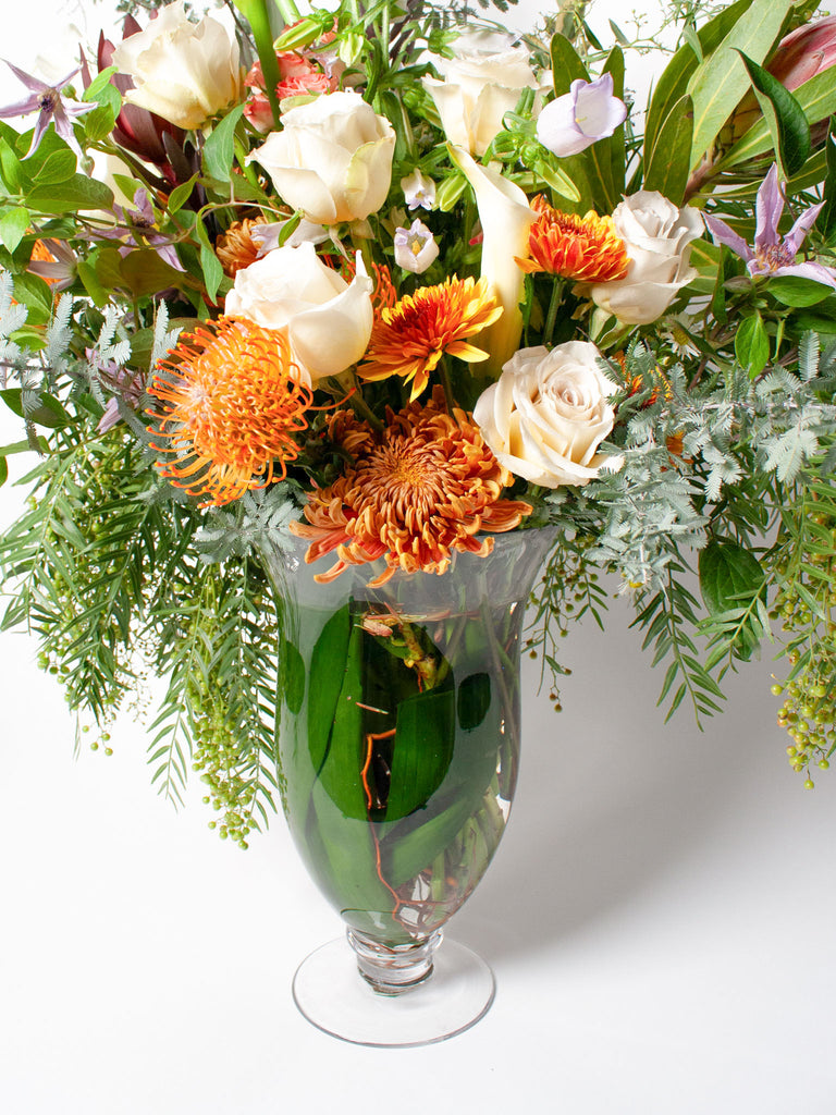 The large and lush arrangement is designed to be viewed from one-side and measures approximately 30-36” H x 20-24” W. All arrangements come in sleek, clear glass vases for your keeping after the event. Brave Floral is a floral foam-free shop, designing all of our arrangements in water.