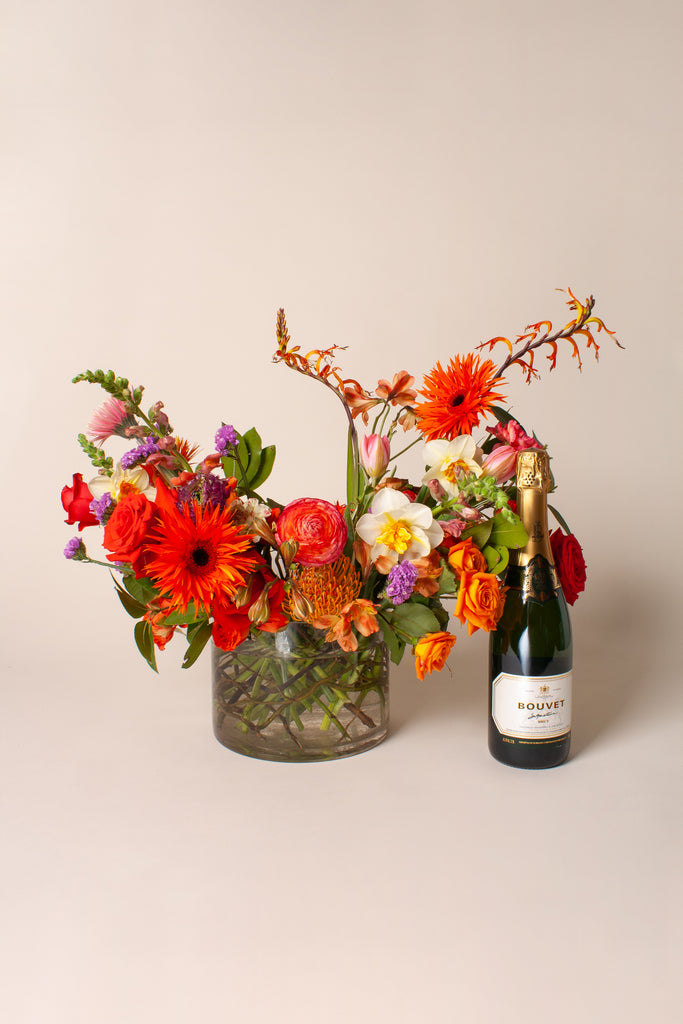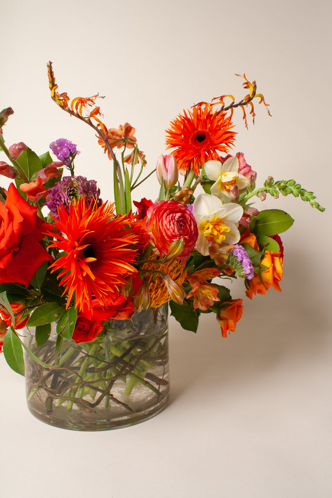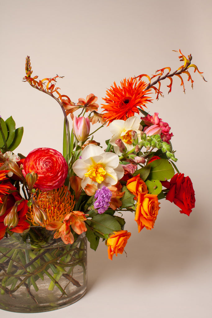 Perfect for wedding table centerpieces, luncheons, or dinner parties this medium, low centerpiece is designed to be viewed all-around and measure approximately 18” H x 20” W. The arrangement comes in a sleek, clear glass cup vase for your keeping after the event. Brave Floral is a floral foam-free shop, designing all of our arrangements in water.