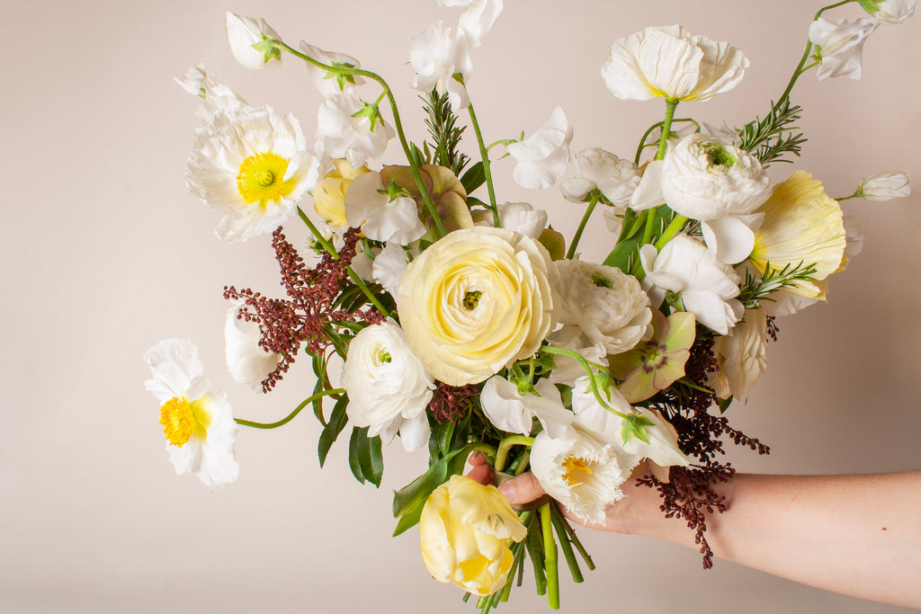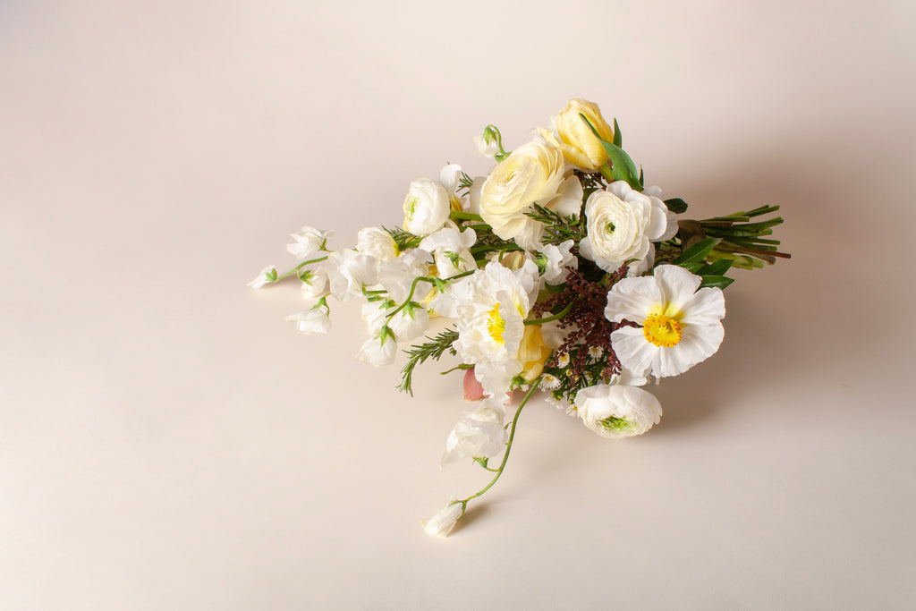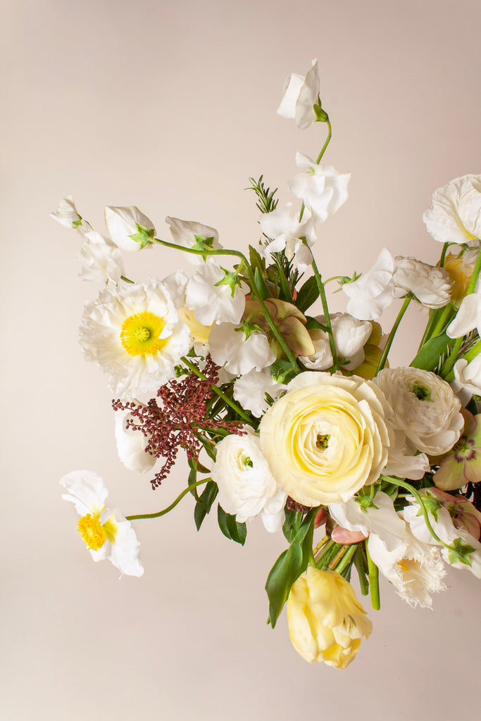 Aromatic greens and whites take you to the open air fields of the French countrysides. Designed with a mix of delicate blooms, wild grasses amd herbs. It's both unfussy and sophisticated, casual yet refined.