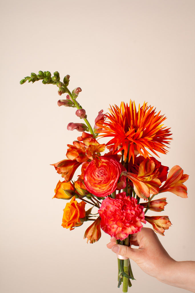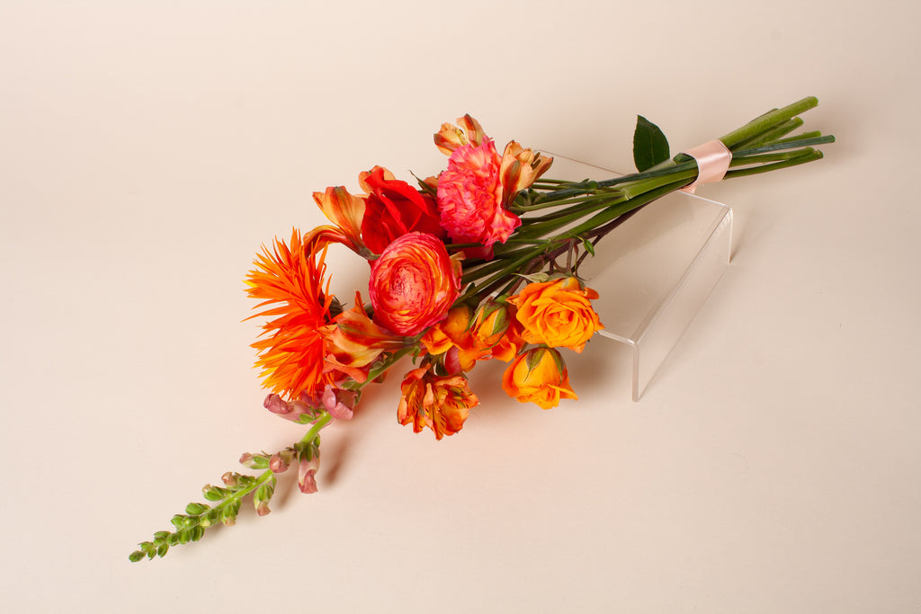 Posy bouquets will measure approximately 6" wide and contain up to (8) stems of floral & foliage. Finished with a satin ribbon wrap on handle with exposed stems.