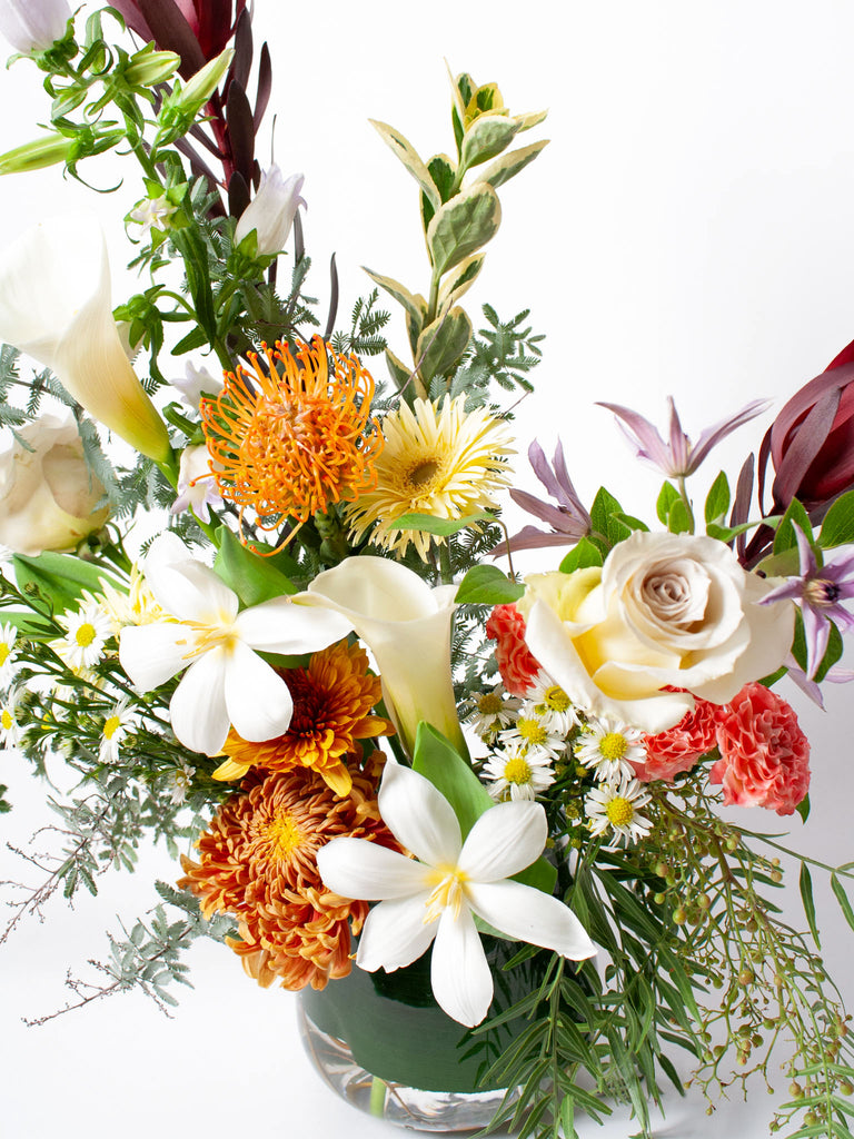 - Designed to be viewed with the majority of florals are on one side of the arrangement.