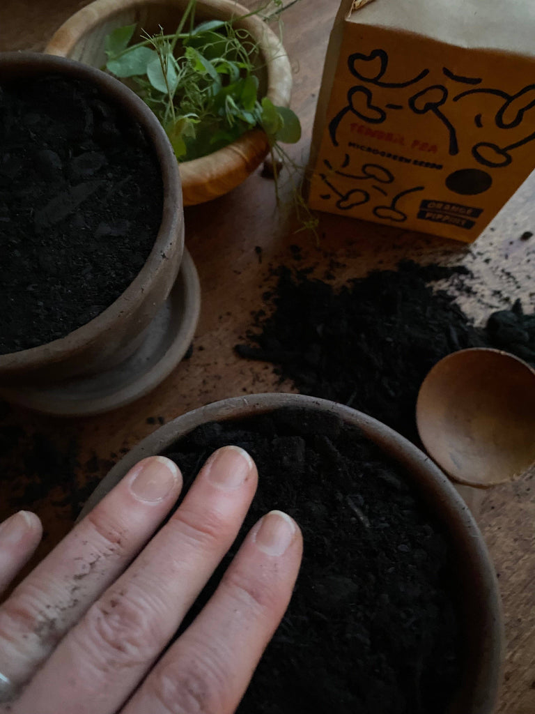 Plant indoors in potting soil in anything from shallow takeout containers to old teacups. They won't require much room for root growth since you harvest them so early. Drainage holes reduce the risk of overwatering but aren’t necessary. Plant densely but not overlapping, cover seeds with a layer of soil, and keep moist but not sodden. Place on a bright windowsill and check daily for water. Harvest by cutting with kitchen shears or a knife when plants reach 3-6 inches according to your preference. Keep watered for another harvest or two!
